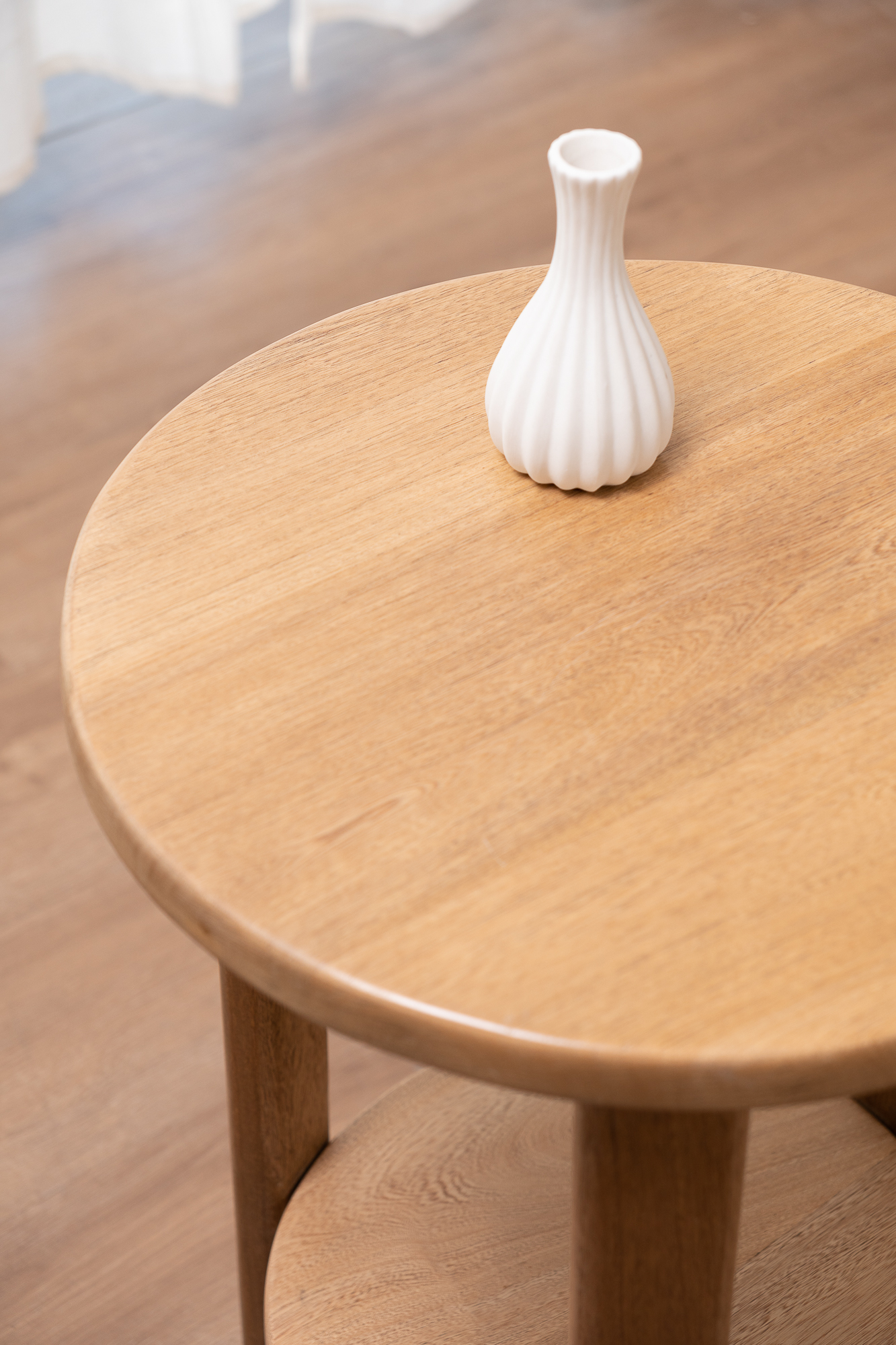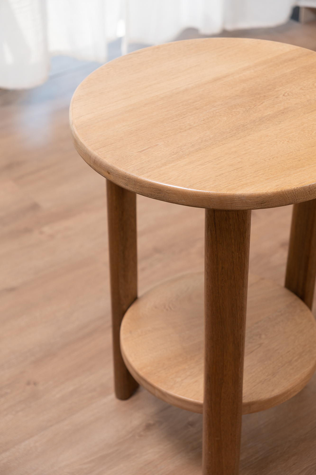 Mesa auxiliar funcional en madera. Su diseño minimalista y líneas limpias la convierten en la compañera ideal para espacios dinámicos, aportando calidez y suavidad al ambiente. Además, cuenta con dos repisas amplias que ofrecen mayor capacidad de almacenamiento. Un mueble versátil que se adapta a cualquier estilo y necesidad.