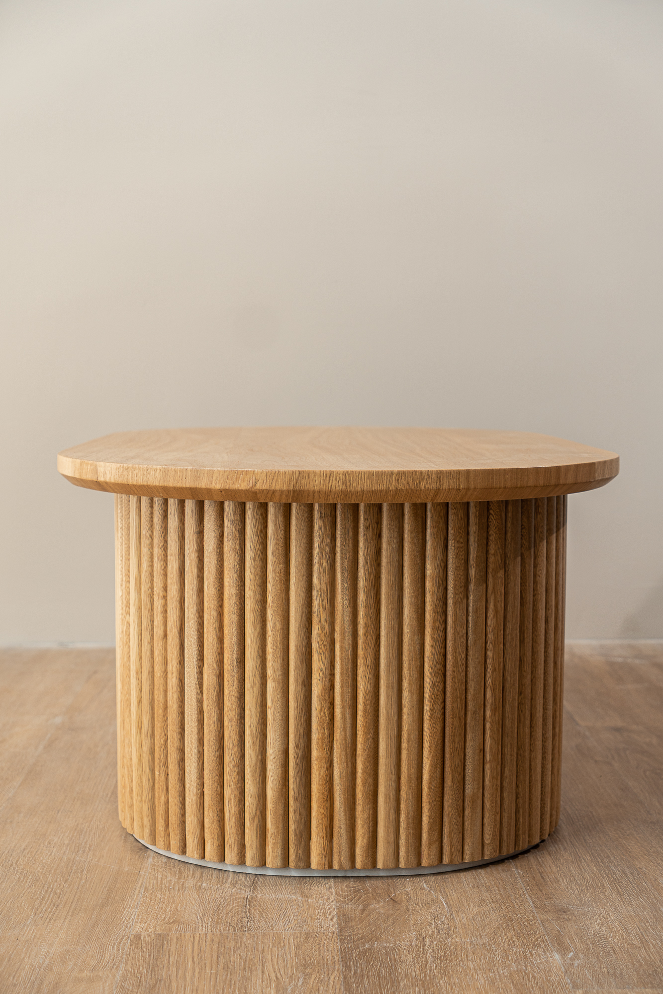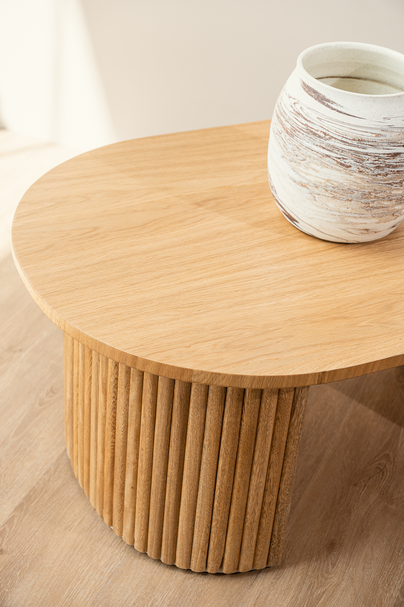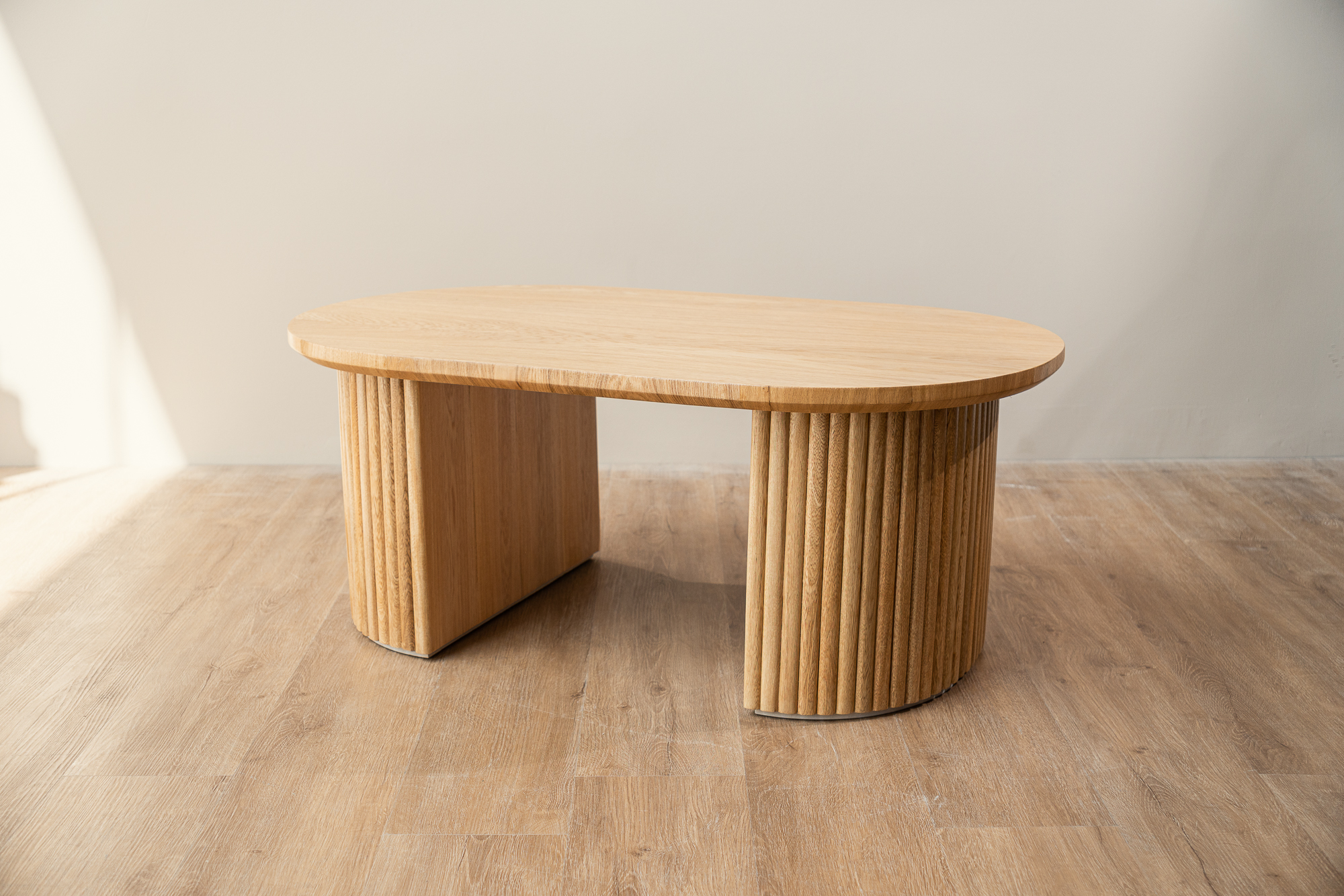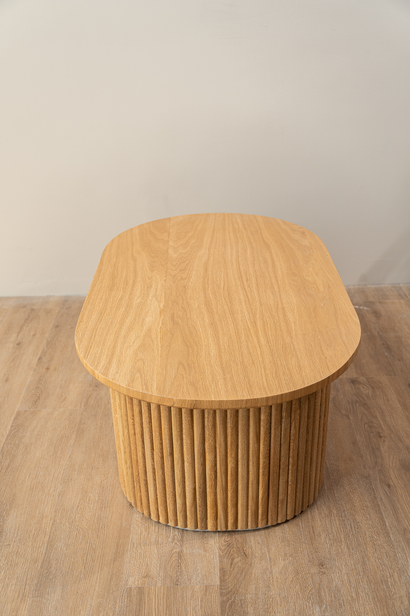 Eleva el estilo de tu sala con esta mesa de centro de diseño moderno y sofisticado. Su elegante tapa ovalada suaviza las líneas de tu espacio, mientras que las patas alistonadas le aportan una textura visual rica y una estructura robusta. Fabricada completamente en la prestigiosa madera Flor Morado, esta pieza garantiza durabilidad y un veteado natural único que añade calidez y autenticidad a tu hogar.