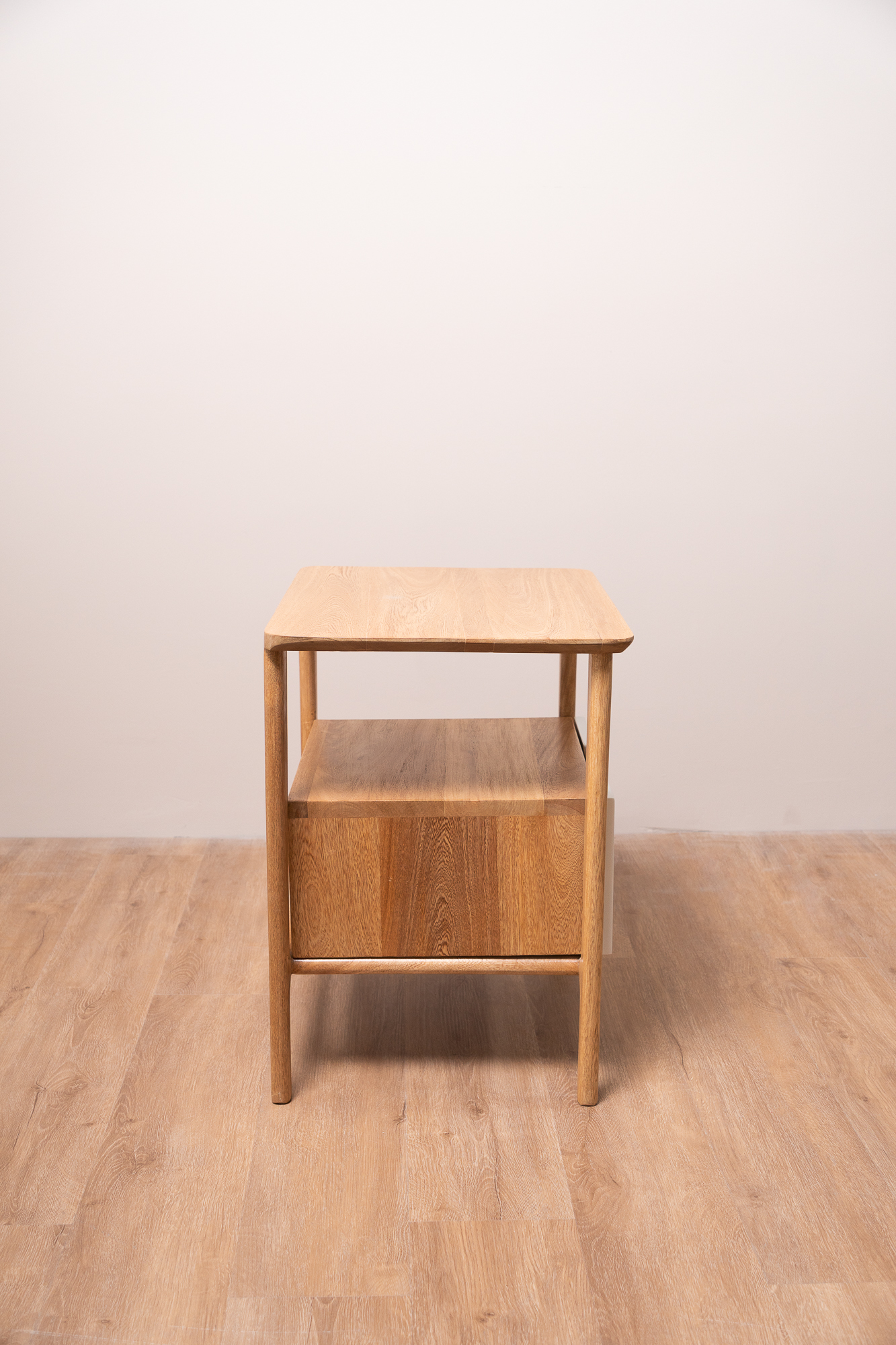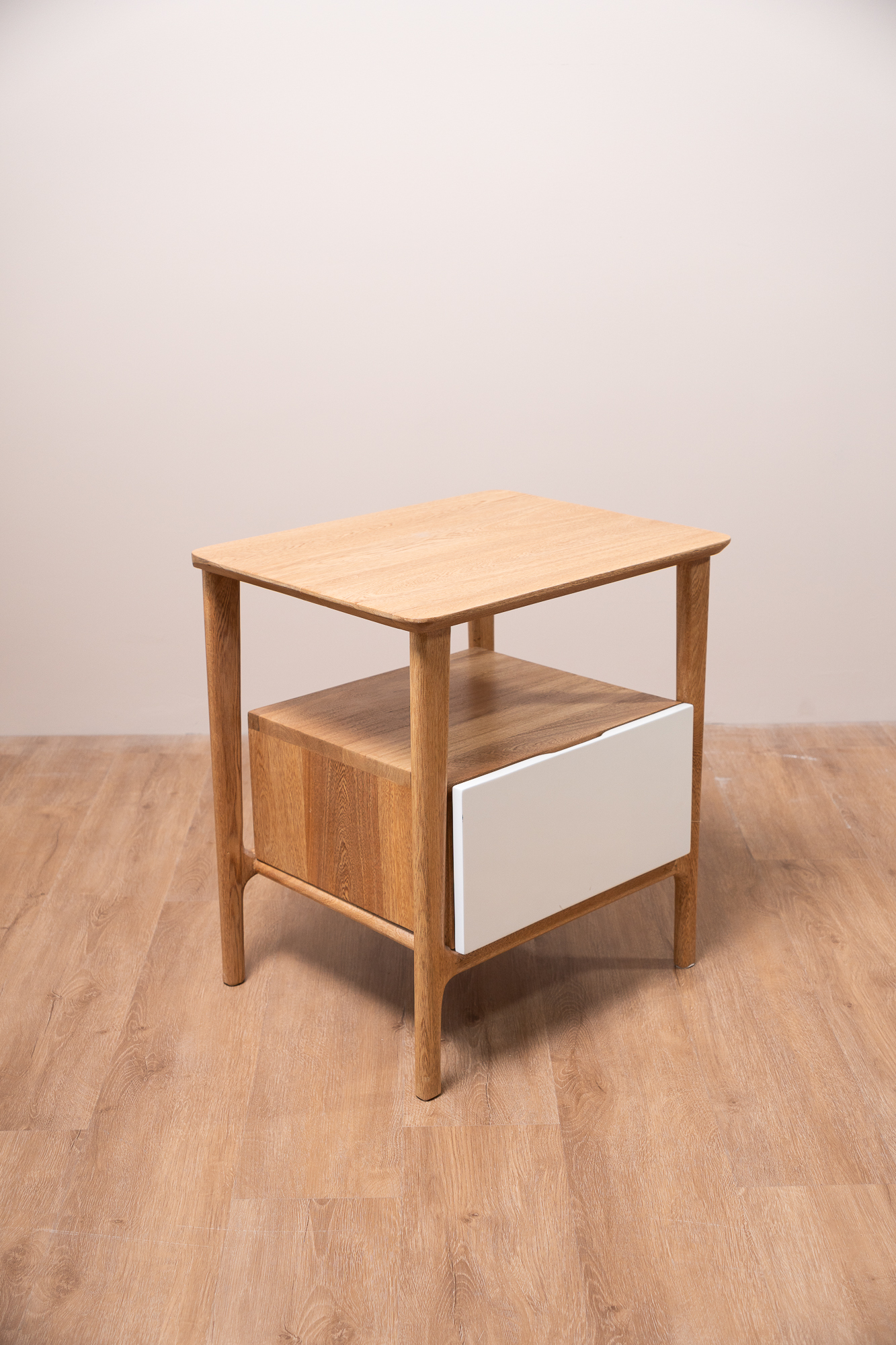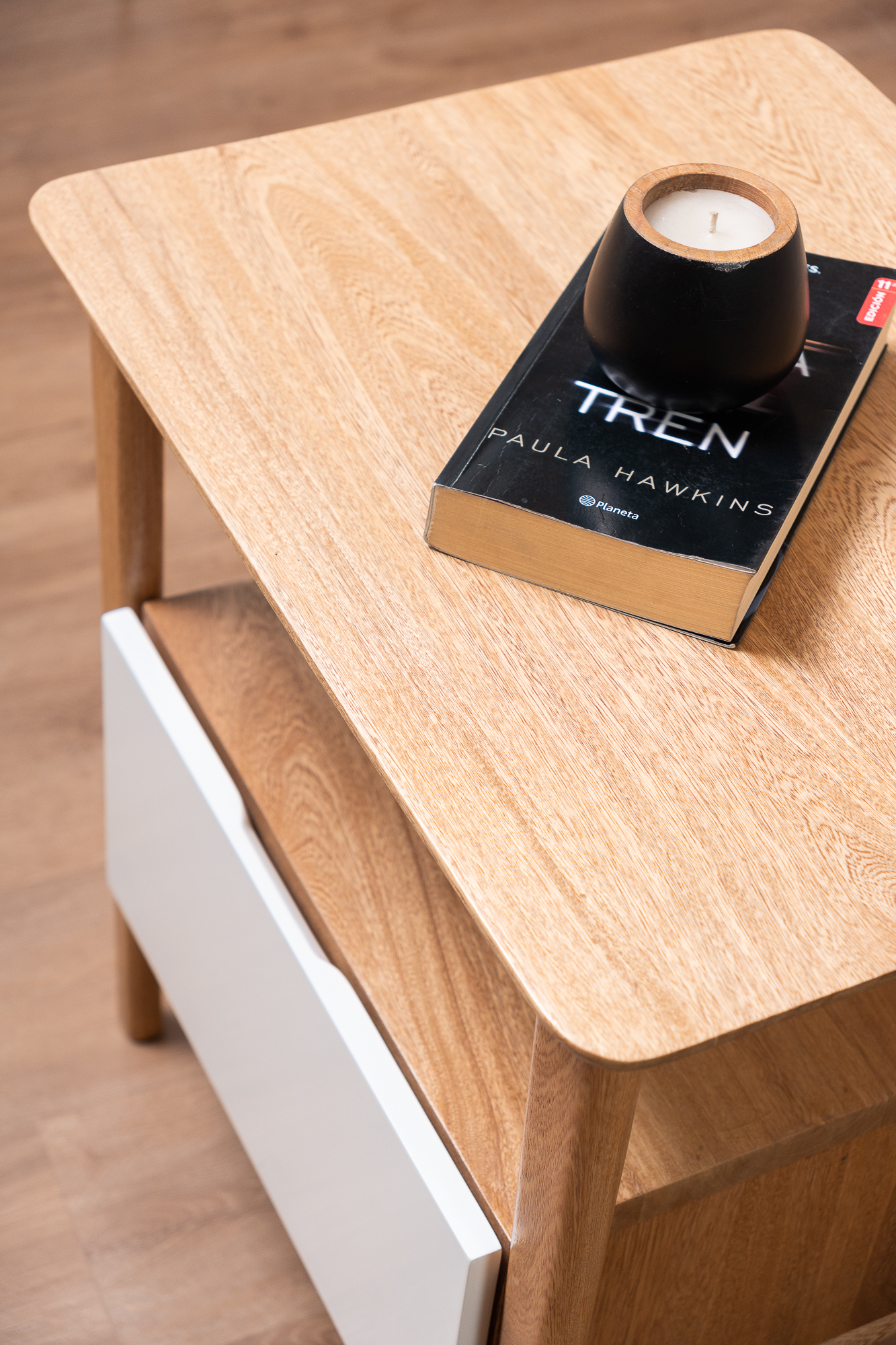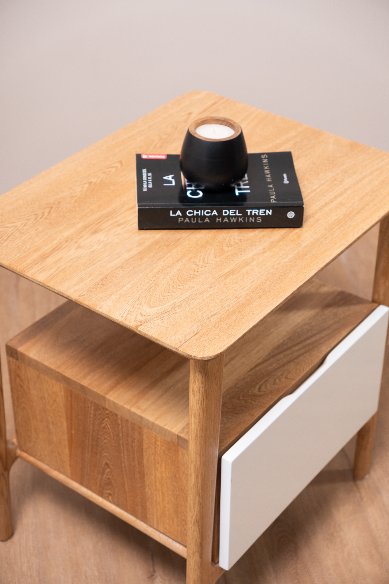 Mesa de noche funcional y moderna. Su diseño escandinavo aportará una sensación de calma y bienestar a tu dormitorio, ideal para disfrutar momentos de descanso y relajación. Sus patas delgadas y su estructura elevada brindan un orden visual al espacio y hacen que el dormitorio se perciba más amplio