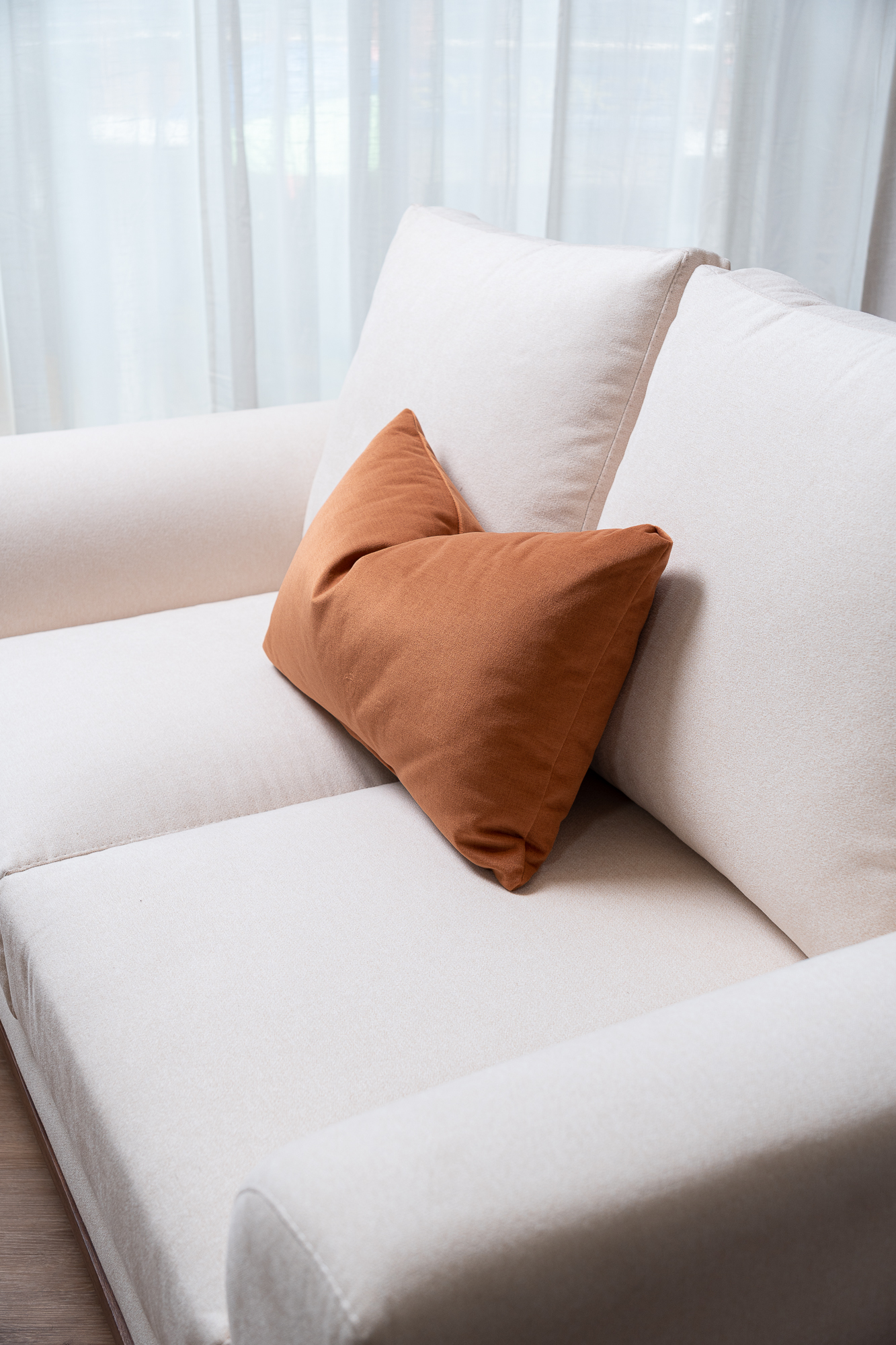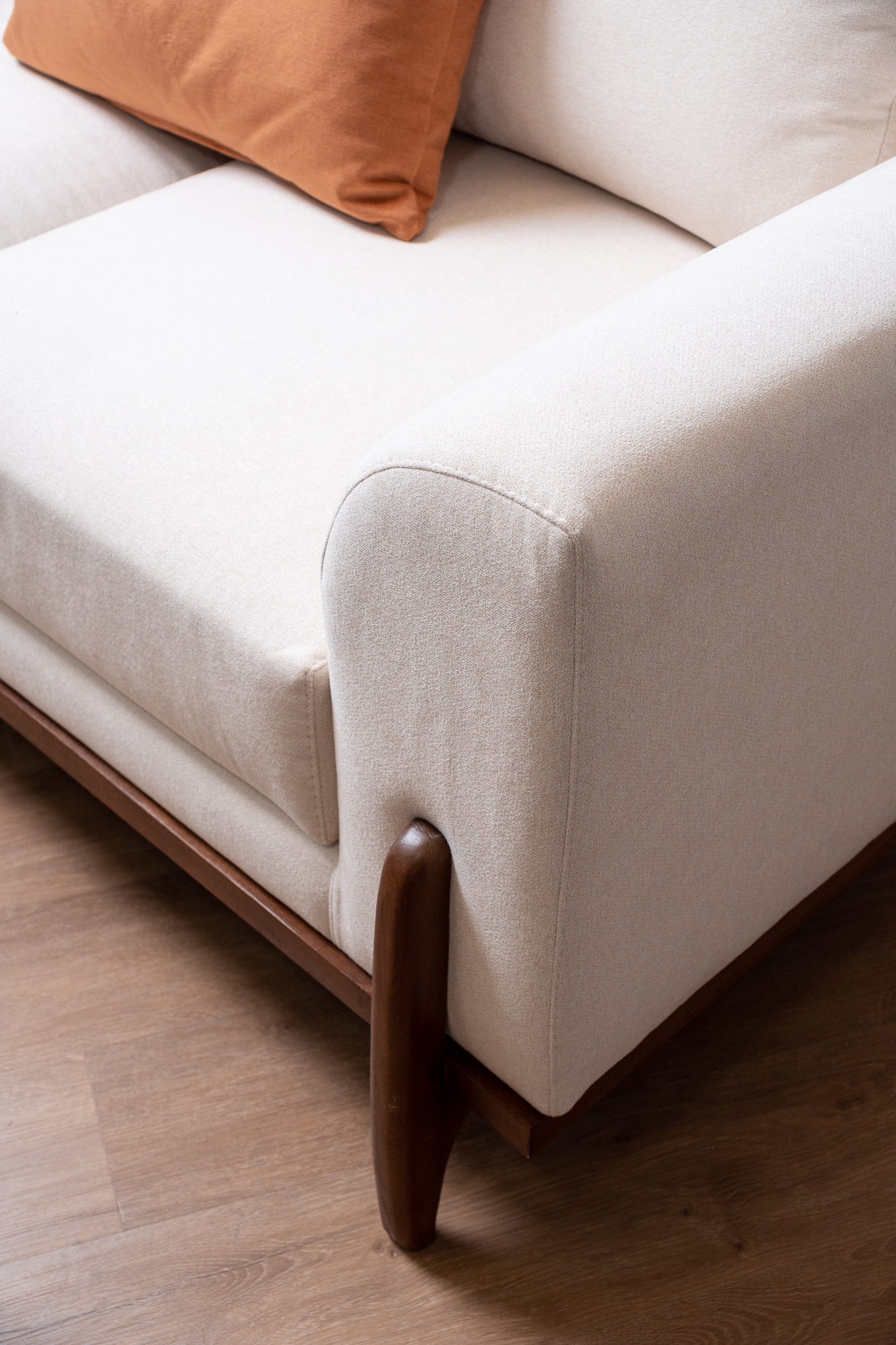 Sofá con diseño moderno y confort . Incorpora un diseño tradicional en su estructura, enriquecido con sutiles toques vanguardistas que modernizan su presencia. Sus apoyabrazos con terminación curva aportan un equilibrio perfecto entre suavidad y carácter, creando una silueta distintiva y armoniosa. La base única en madera flor morado no solo añade un detalle artesanal de gran belleza, sino que también introduce un acento cálido y sofisticado que hará que tu espacio tenga una personalidad única.