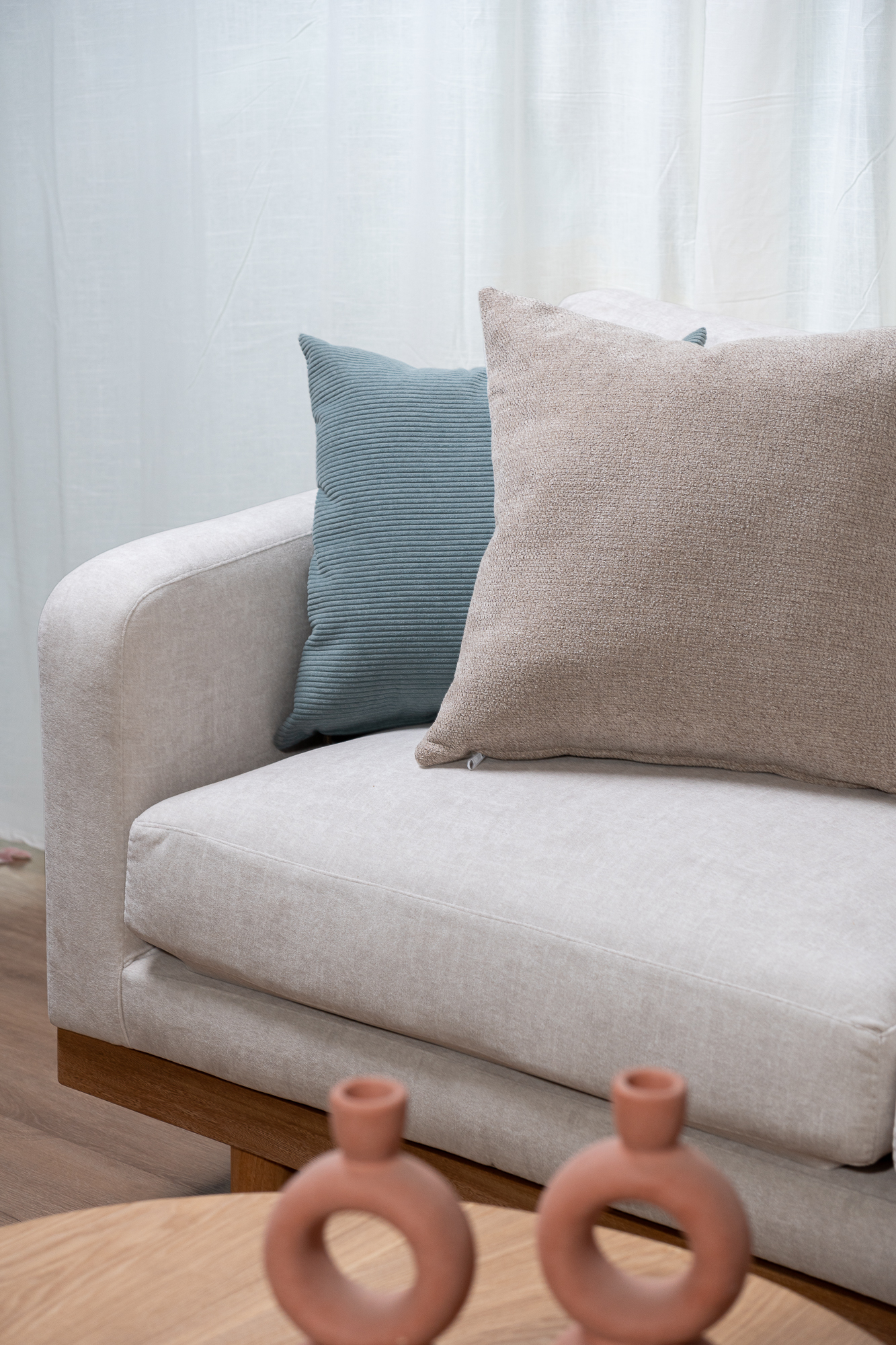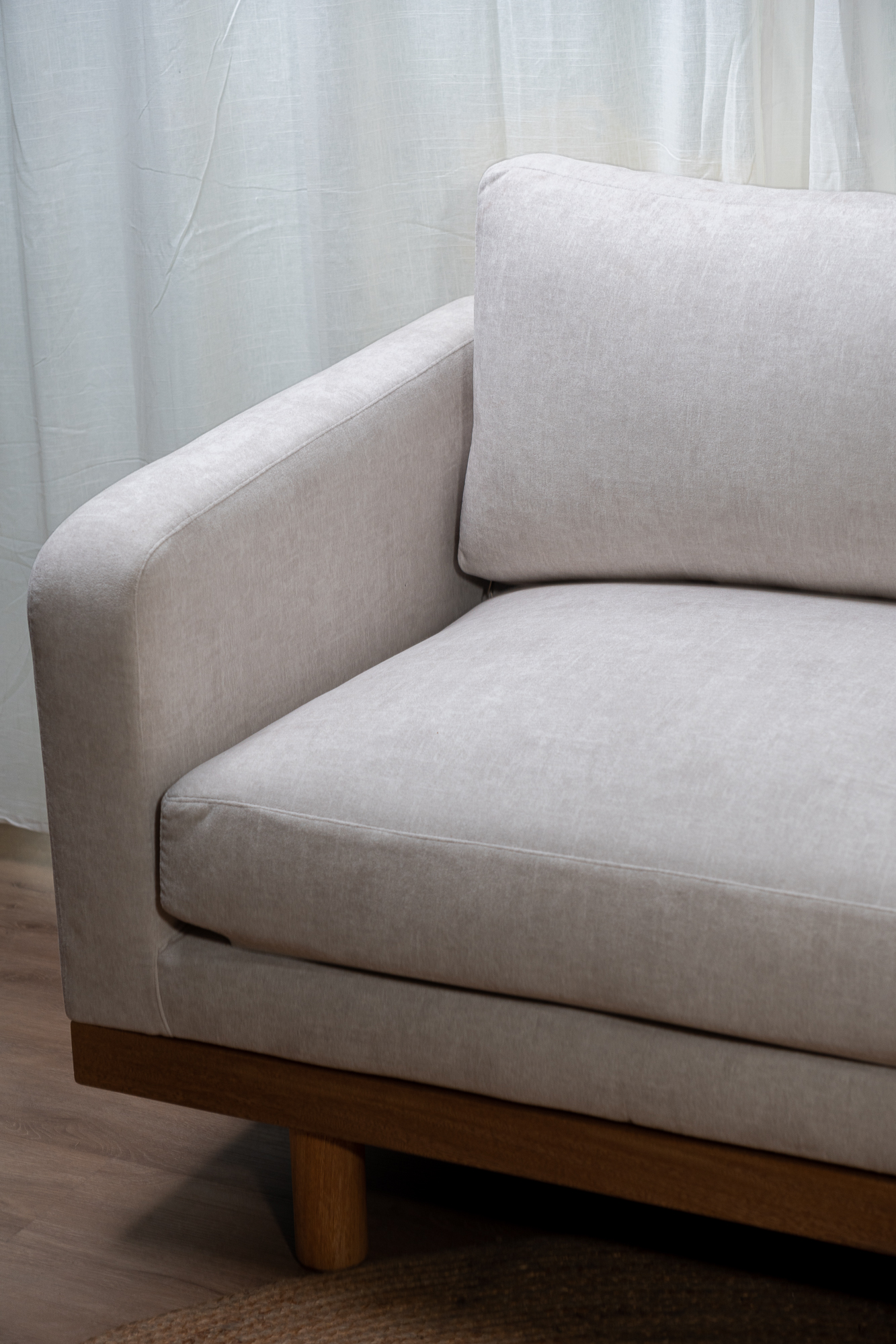 Sofá de diseño moderno y elegante, con líneas definidas y terminaciones curvas que le aportan un carácter equilibrado y sofisticado. Su delicada silueta lo convierte en una pieza ideal para espacios con contrastes suaves, donde puede integrarse con armonía y aportar una sensación de calidez y serenidad.