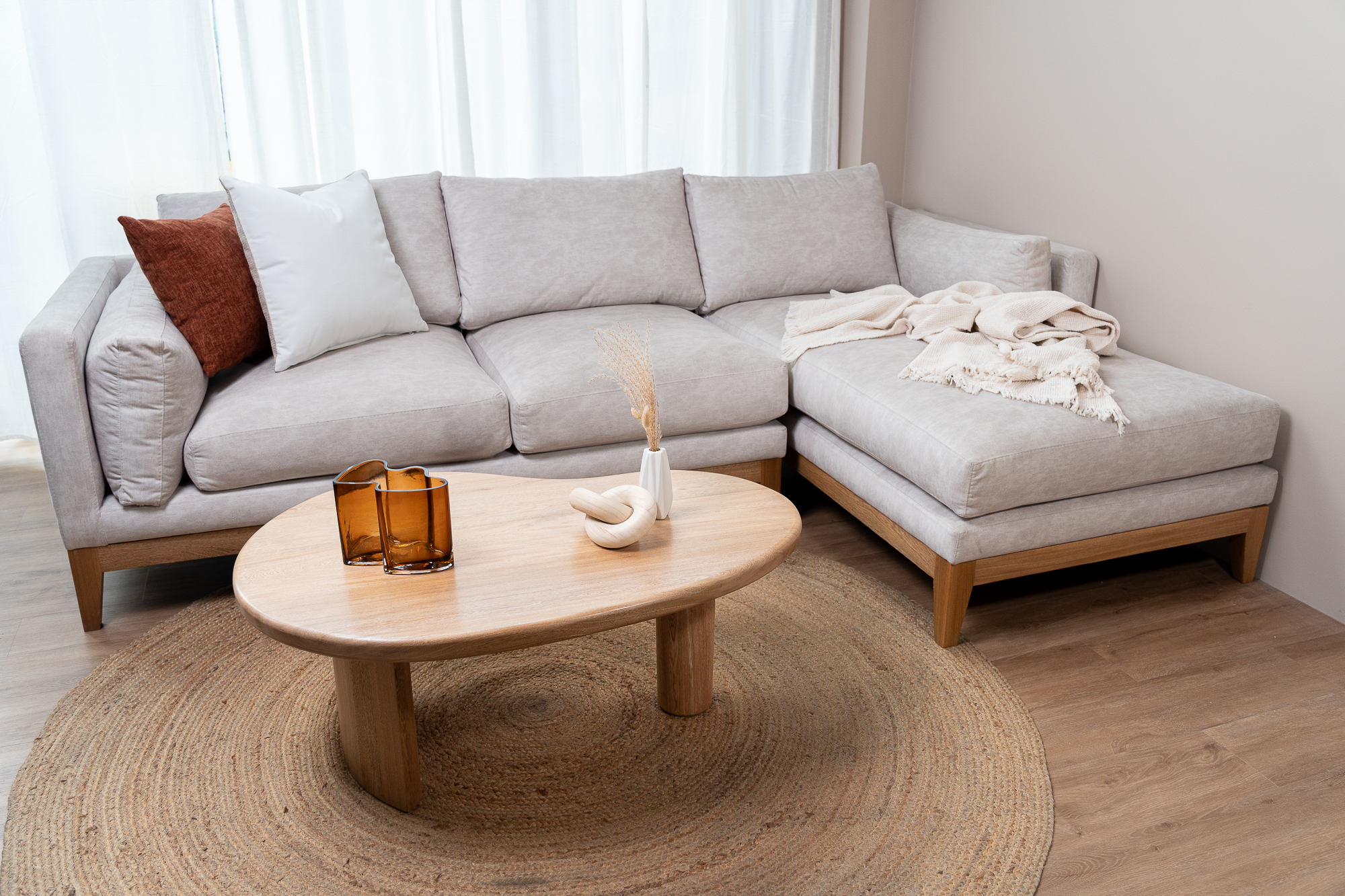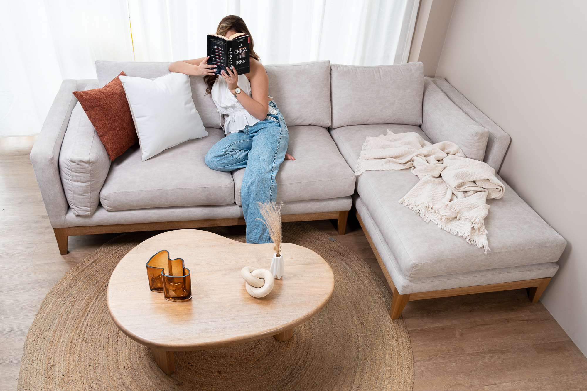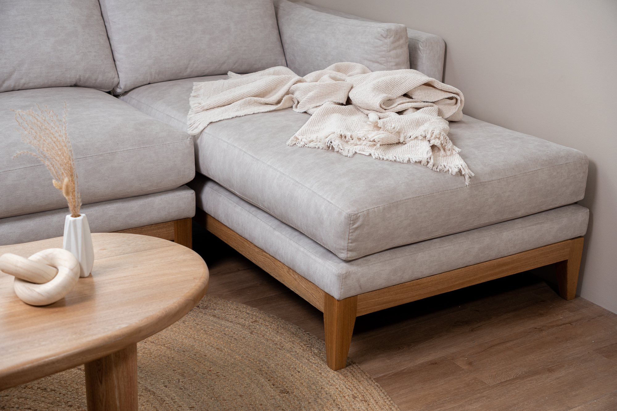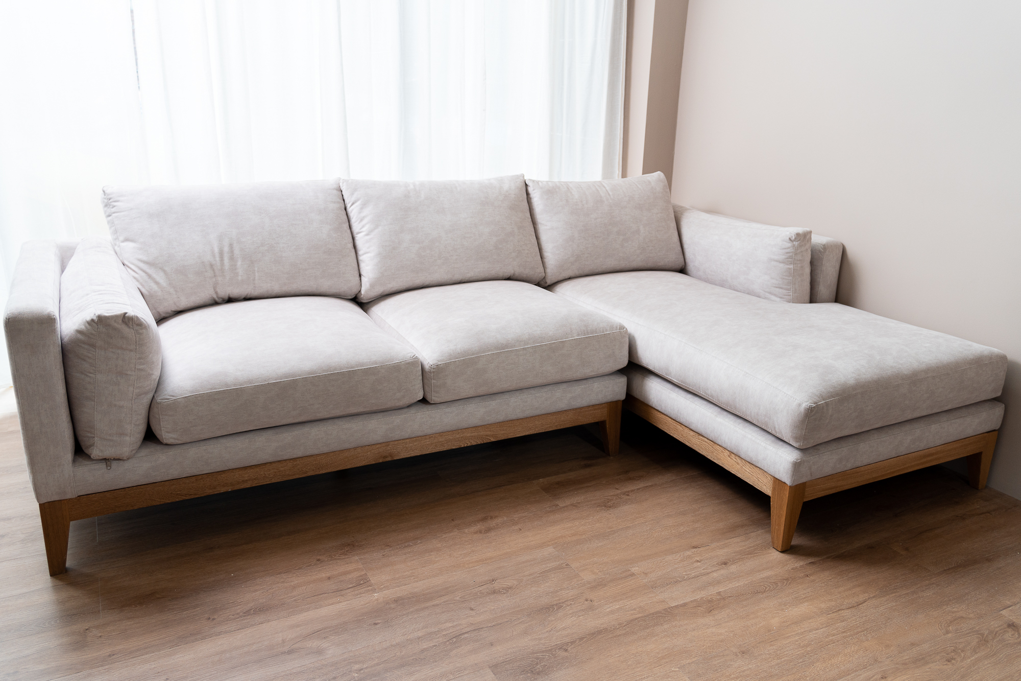 Sofá en L diseñado para hacer de tu sala un lugar acogedor. La mezcla ideal entre estética, comodidad y funcionalidad. Con pequeños detalles en madera flormorado y una estructura con fluidez y carácter, añadido a un chaise long.