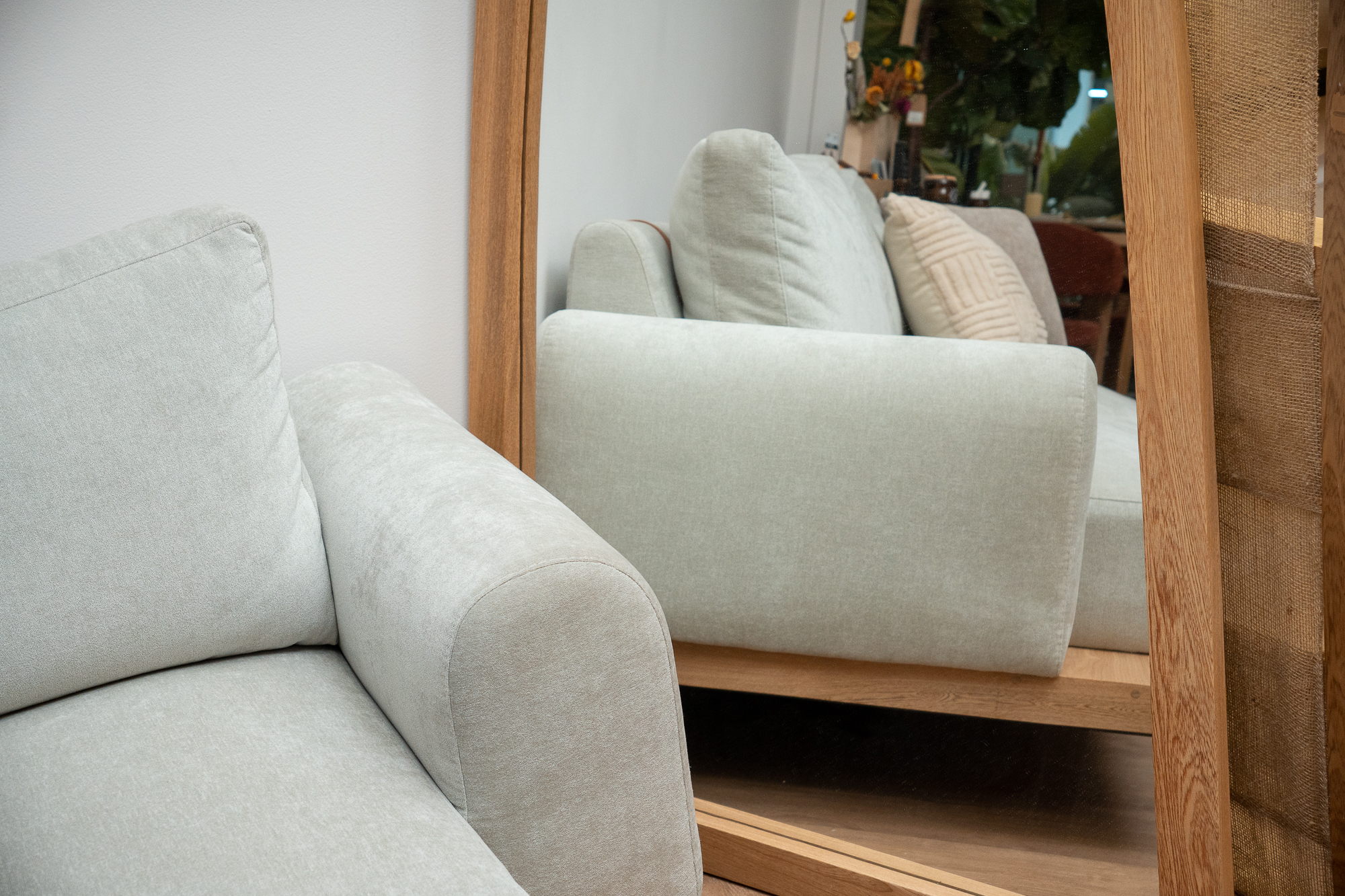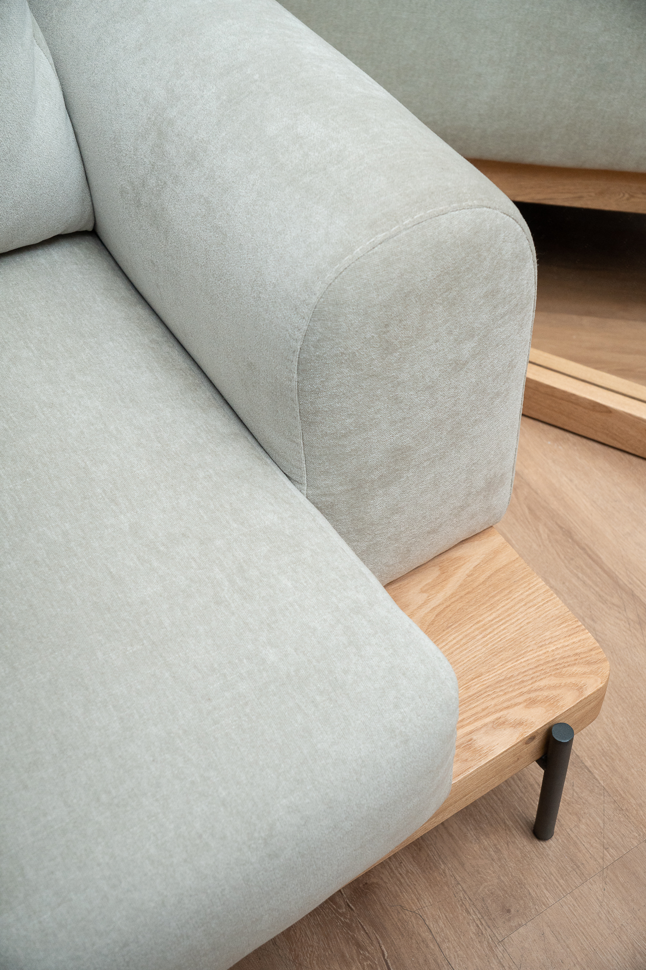 Sofá moderno y confortable. Combina la elegancia del estilo industrial con el minimalismo. Cuenta con una base sólida de hierro y madera maciza de flor morado, que aporta carácter al espacio y confort.